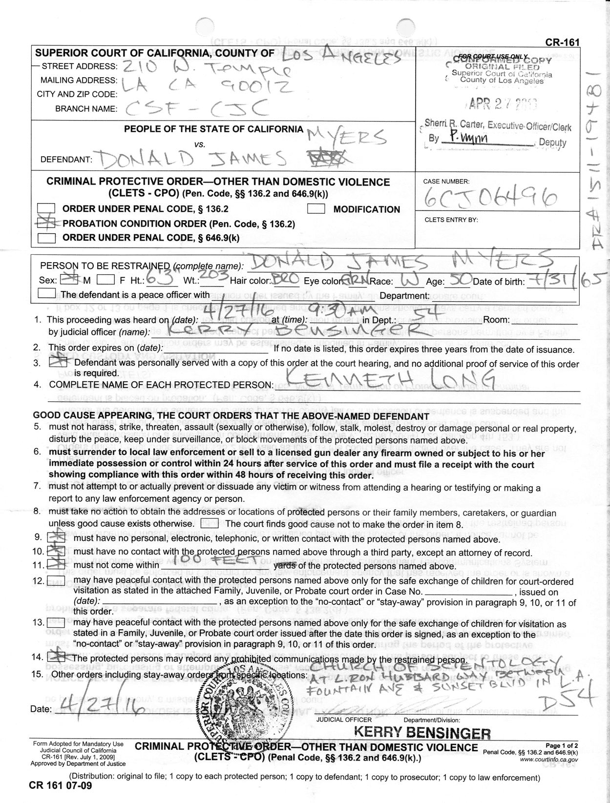 KENNETH LONG CRIMINAL PROTECTIVE ORDER 04/27/2016 |