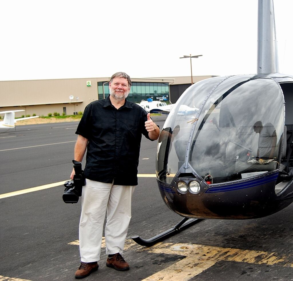 Bunker got an aerial tour of Gold Base in a helicopter to gather material