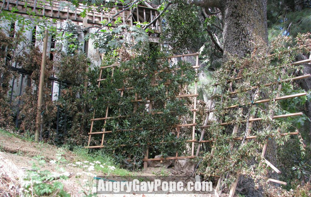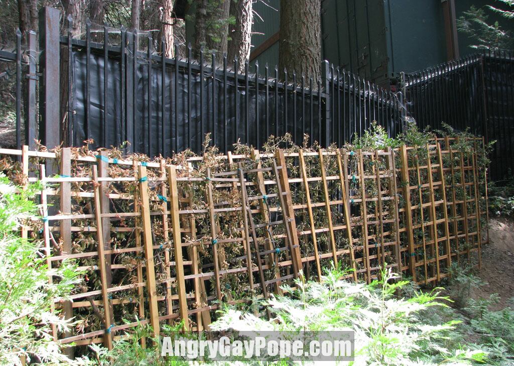 Trying to hide the fence with dead plants and trellises |