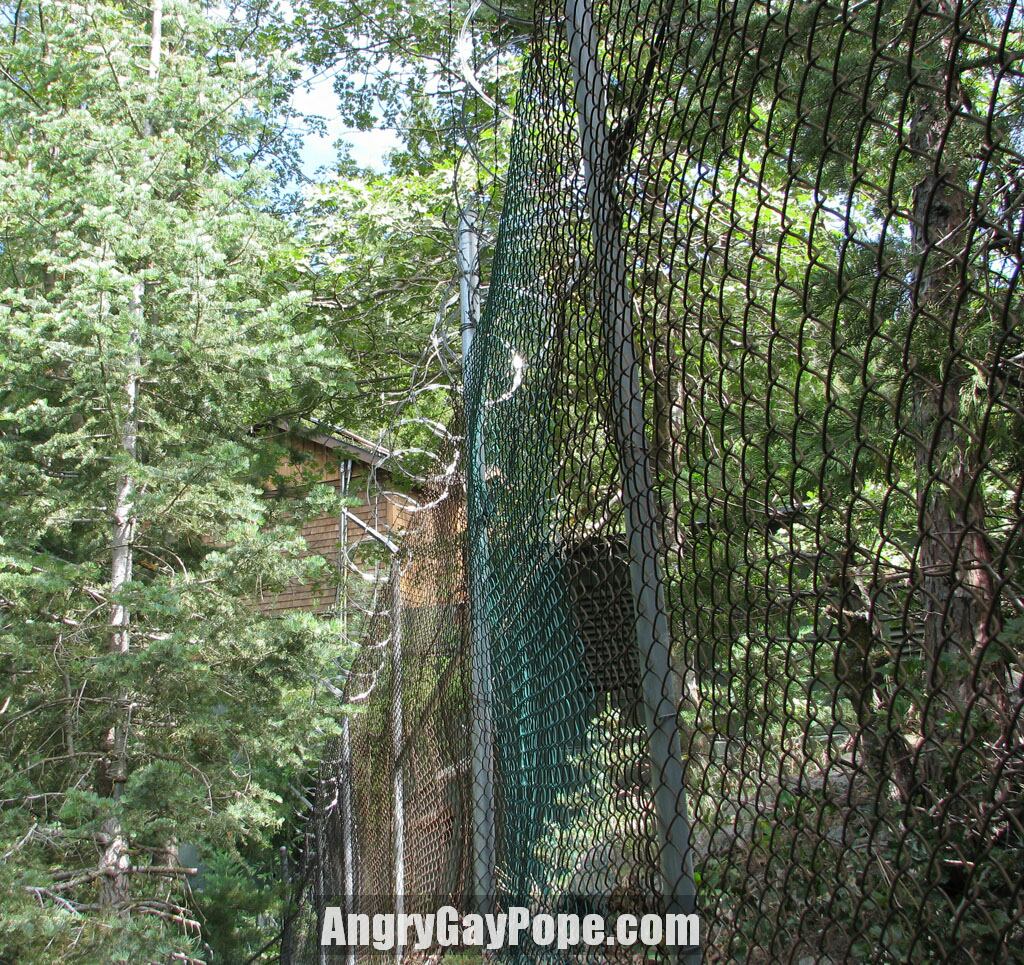 The private fence is over ten feet tall and topped with concertina wire |